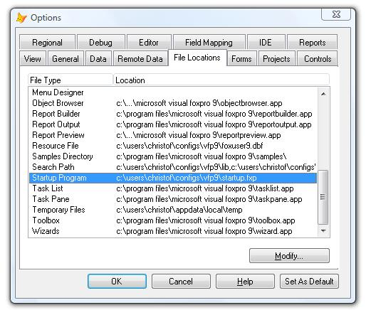 You have to repeat this step everytime you restart Visual FoxPro and want access to the Guineu menu. There are two solutions to avoid repeating this step manually. First of all, you could enter GuineuIDE.EXE as you start up program. Go to Tools > Options... and switch to the File Locations tab.