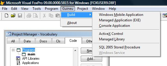 GuineuIDE adds a new menu item Guineu that basically consists of a Build menu. The options in the Build menu are only enabled, when you have a Project Manager window open.